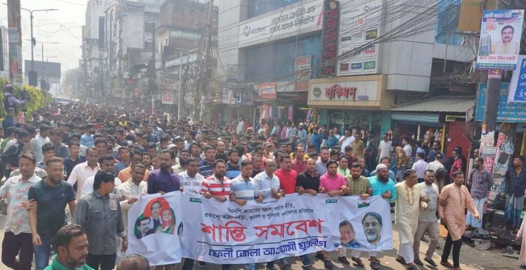 ফেনী শহরের ট্রাংক রোডে বিএনপি-জামায়াতের সন্ত্রাস-সহিংস নীতি, জনগন ও পুলিশের উপর হামলার প্রতিবাদে শান্তি সমাবেশ করেছে ক্ষমতাসীন আওয়ামীলীগের সহযোগি সংগঠন যুবলীগ। শনিবার সকালে পৌরসভার সামনে থেকে বের হওয়া মিছিলে নেতৃত্ব দেন সংগঠনটির জেলা সভাপতি দিদারুল কবির রতন।