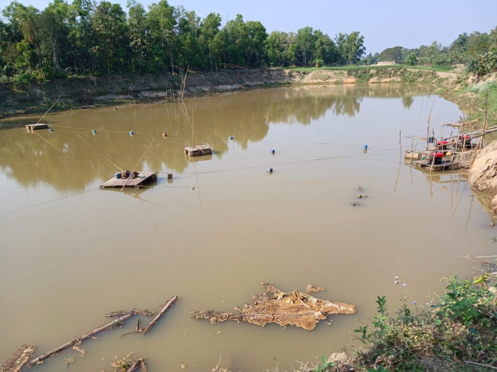 সরেজমিনে দেখা গেছে, ইজারা নেয়া বালুমহাল থেকে নদীর বাইরে দূলবর্তী স্থানে বসানো হয়েছে তিনটি ড্রেজার। সড়কের পাশে রয়েছে বালুর স্তুপ। এখানে টিলার উপর একটি টিনের ঘরে দেখা মিললো স্থানীয় এক ব্যক্তির।