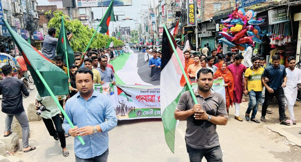 স্বাধীন রাষ্ট্র ফিলিস্তিনের স্বীকৃতি এবং নিরীহ ফিলিস্তিনিদের উপর পরিচালিত মানবতাবিরোধী অপরাধের বিরুদ্ধে বিশ্বব্যাপী শিক্ষার্থী সমাজ, শিক্ষক ও সচেতন নাগরিকরা যে আন্দোলনের সূচনা করেছে তার প্রতি সংহতি প্রকাশ করে পদযাত্রা ও সমাবেশ করেছে ফেনী জেলা ছাত্রলীগ।