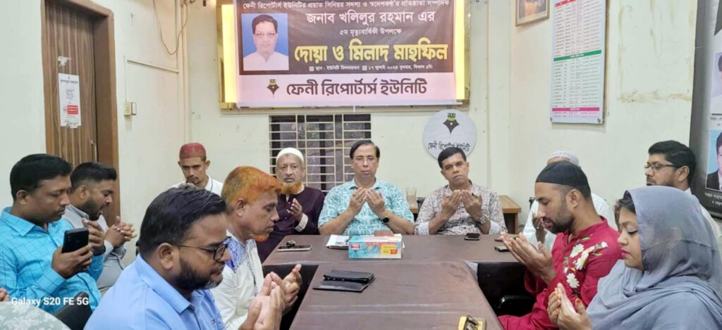 সাপ্তাহিক স্বদেশকন্ঠ প্রতিষ্ঠাতা সম্পাদক, ফেনী রিপোর্টার্স ইউনিটির প্রয়াত সদস্য খলিলুর রহমানের ৫ম মৃত্যুবার্ষিকী উপলক্ষ্যে বুধবার বিকালে ইউনিটিতে আলোচনা সভা, দোয়া মোনাজাত ও মিলাদ মাহফিল অনুষ্ঠিত হয়েছে। দোয়া ও মিলাদ পরিচালনা করেন কোর্ট মসজিদের সহকারী ইমাম মাওলানা আবদুল আলীম।