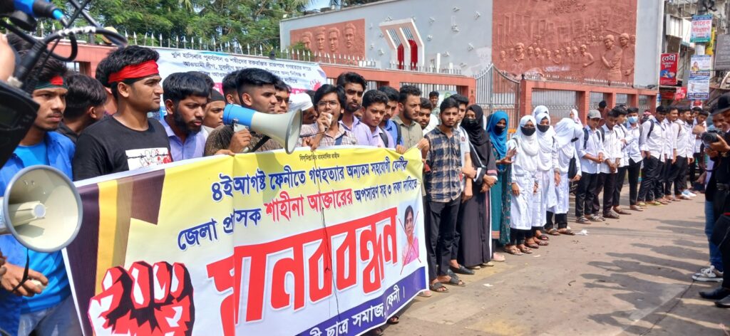 শিক্ষার্থী নাঈম ফরায়জীর পরিচালনায় বিপ্লবী ছাত্র সমাজের ব্যানারে মানববন্ধনে বক্তব্য রাখেন ফেনী সরকারি কলেজের শিক্ষার্থী শাহরিয়ার সোহান ও আবদুল্লাহ উবায়ের অন্তু, সোনাগাজী সরকারি কলেজের শিক্ষার্থী রেদোয়ানুল ইসলাম, ফেনী সরকারি পলিটেকনিক ইনস্টিটিউটের শিক্ষার্থী রফিকুল ইসলাম রাতুল। এসময় “আশা ছিল উন্নতি আর শান্তি, করেছেন অনিয়ম আর দুর্নীতি”, “আবু সাইদ মুগ্ধ, শেষ হয়নি যুদ্ধ”, “আওয়ামীলীগের দোসর শাহীনা আক্তারের বিচার চাই” এমন নানা শ্লোগান দেয় আন্দোলনকারী শিক্ষার্থীরা। পরে শহীদ মিনার চত্বর থেকে মিছিল শুরু করে পুরাতন জেল রোড প্রদক্ষিণ করে ট্রাংক রোডের দোয়েল চত্বর এসে শেষ হয়।