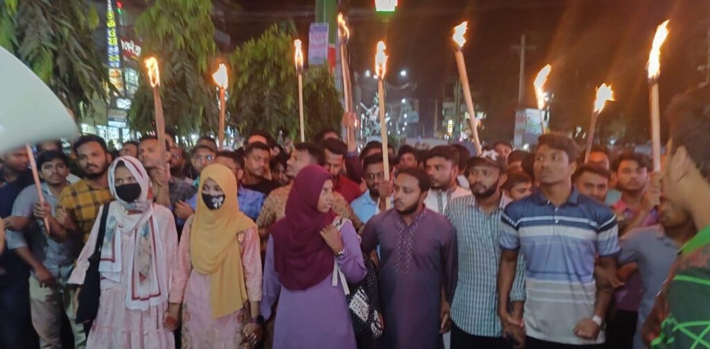 ‘শেখ হাসিনা পদত্যাগ করেনি’ রাষ্ট্রপতি সাহাবুদ্দিন চুপ্পুর দেয়া বক্তব্য প্রত্যাখান করে ফেনীতে মশাল মিছিল করেছে বৈষম্য বিরোধী ছাত্র আন্দোলন। সোমবার সন্ধ্যা ৭টায় শহরের কেন্দ্রীয় শহীদ মিনারের সামনে থেকে শুরু শহরের প্রধান সড়ক প্রদক্ষিণ করে পুনরায় শহীদ মিনারের সামনে গিয়ে শেষ হয়। এসময় বৈষম্য বিরোধী ছাত্র আন্দোলনের সংগঠক আব্দুল্লাহ আল যোবায়ের, সমন্বয়ক আব্দুল আজিজ, সংগঠক বদরুদ্দোজা নোবেল, জয়নুল আবেদীন সাগর, সানী মজুমদার, সহ-সমন্বয়ক সুরাইয়া আক্তার প্রমুখ উপস্থিত ছিলেন।
