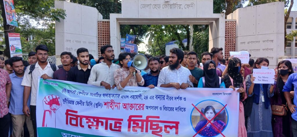 ফেনীর বিতর্কিত জেলা প্রশাসক মুছাম্মৎ শাহীনা আক্তারের অপসারণ ও বিচার দাবীতে বিক্ষোভ মিছিল করেছে সাধারন শিক্ষার্থীরা। বৃহস্পতিবার সকালে শহরের ট্রাংক রোডের কেন্দ্রীয় শহীদ মিনারের সামনে থেকে বিপ্লবী ছাত্র সমাজের ব্যানারে বিক্ষোভ মিছিল শুরু হয়। মিছিলটি প্রধান সড়ক প্রদক্ষিণ করে জেলা প্রশাসক কার্যালয়ের সামনে গিয়ে অবস্থান করে শিক্ষার্থীরা।এসময় নাঈম ফরায়েজির পরিচালনায় এসময় বক্তব্য রাখেন ফেনী সরকারি কলেজের শিক্ষাার্থী আনু জাফর, সৌরভ হোসেন শাকিল, নাইমুল ইসলাম, ফেনী পলিটেকনিক ইনস্টিটিউটের রফিকুল ইসলাম রাতুল, আইসিএসটির সালে উদ্দিন শাওন, ফেরকান উদ্দিন সিয়াম প্রমুখ বক্তব্য রাখেন।