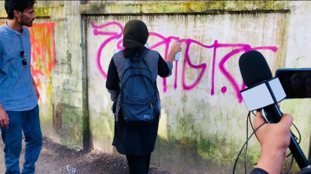 চব্বিশের কোটা সংস্কার আন্দোলনে যখন কয়েকজন জড়ো হয় প্রতিবাদ করা কঠিন হয়ে পড়ে তখন গ্রাফিতি আঁকার। প্রশাসনের পাশাপাশি তৎকালীন ক্ষমতাসীন দলের নেতাকর্মীদের তোপের মুখে গ্রাফিতি আঁকাতো দূরের কথা, শিক্ষার্থীরা জড়ো হওয়া ছিল দুষ্কর। ২৭ জুলাই রাতের শহরের তাকিয়া রোড সংলগ্ন পানির ট্রাংকি রোডে ১০-১২ জন ছাত্র-ছাত্রী জড়ো হয়ে আঁকা শুরু করে গ্রাফিতি। প্রথমবারের মতো গ্রাফিতিতে ‘শিক্ষা-ছাত্রলীগ এক সঙ্গে চলেনা’ আঁকা হয়। রং-তুলির আঁচড়ে ফুটে উঠা প্রতিবাদে মাত্রা যোগ হয় কয়েকগুন। দিনেদিনে দেওয়াল লিখন আর গ্রাফিতিতে সাজে শহরের বিভিন্ন পাড়া-মহল্লা। এখনো সেই চিত্র জুলাই-আগস্টে ছাত্র-জনতার গণঅভ্যূত্থানে সরকার পতনের ইতিহাস দেওয়ালে দেওয়ালে দৃশ্যমান।