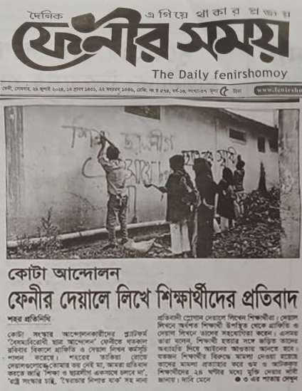 সরেজমিনে দেখা যায়, ফেনী সরকারি কলেজ প্রাঙ্গণ, শহীদ শহীদুল্লা কায়সার সড়ক, ডাক্তারপাড়া, কলেজ রোড, মাস্টারপাড়া, মিজান রোড, রাজাঝির দিঘীর পাড় ও মুক্তবাজারসহ বিভিন্ন এলাকার দেয়ালে দেয়ালে সচেতনতার পাশাপাশি শোভা পায় শিক্ষার্থী ও স্বেচ্ছাসেবকদের আঁকা রঙিন গ্রাফিতি। জেলা শহর থেকে শুরু করে উপজেলাগুলোতেও তারুণ্যের রং-তুলিতে ফুটে উঠেছে গুলির সামনে বুক চিতিয়ে দাঁড়ানো আবু সাঈদের রক্তাক্ত সেই ছবি।