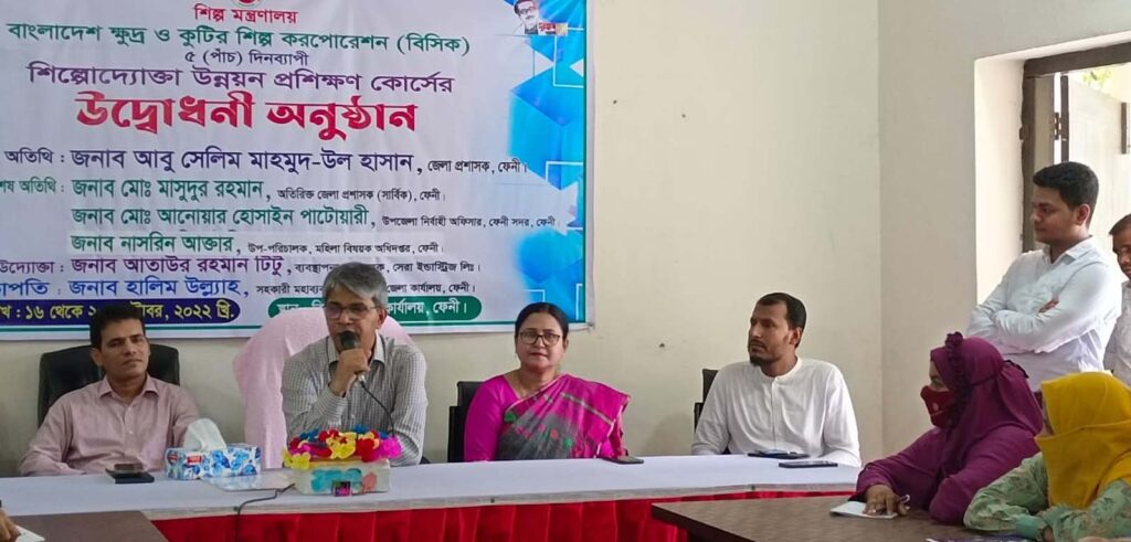 বাংলাদেশ ক্ষুদ্র ও কুটির শিল্প কর্পোরেশন (বিসিক) ফেনী এর উদ্যোগে ৫ দিন ব্যাপী শিল্প উদ্যোক্তা উন্নয়ন প্রশিক্ষণ কোর্স শুরু হয়েছে। গকাল সোমবার বিসিক জেলা কার্যালয়ে প্রধান অতিথি থেকে প্রশিক্ষণের আনুষ্ঠানিক উদ্বোধন করেন জেলা প্রশাসক আবু সেলিম মাহমুদ উল হাসান।