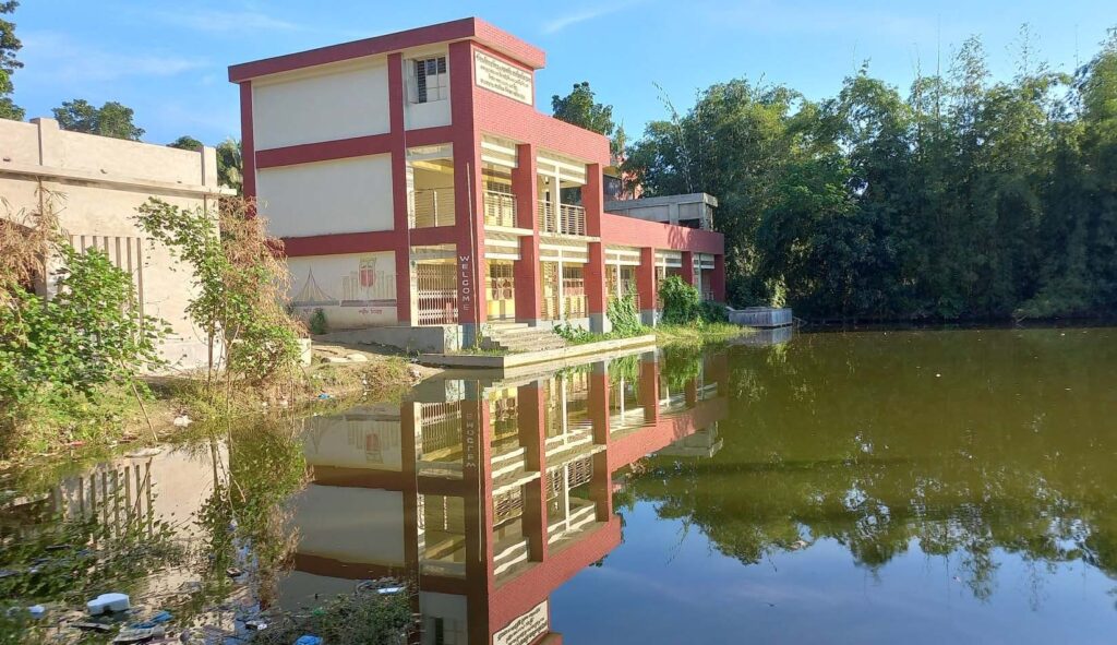 স্কুলের সামনেই পুকুর, নেই কোন প্রাচীর। এ্যাসেম্বলী হয় পাশ্ববর্তী হাই স্কুলের মাঠে। বর্ষা মৌসুমে স্কুলে আসা-যাওয়া করতে হয় কাঁদাপানি মাড়িয়ে। দীর্ঘদিন ধরে ফেনী সদর উপজেলার পাঁচগাছিয়া ইউনিয়নের পশ্চিম বিজয়সিংহ-২ সরকারি প্রাথমিক বিদ্যালয়ের সামনে এ অবস্থা নিয়ে চিন্তিত অভিভাবকরা। দূর্ঘটনার আশংকায় সন্তানদের স্কুলে পাঠিয়ে অভিভাবকরা আতংকে দিন কাটান।