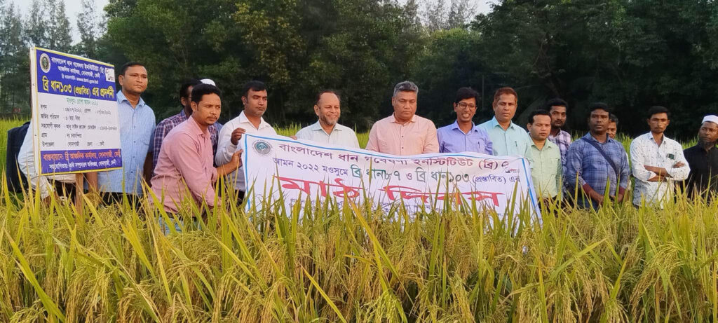 সোনাগাজীতে আঞ্চলিক ধান গবেষনা ইনস্টিটিউটের বিজ্ঞানীদের নতুন উদ্ভাবিত উচ্চ ফলনশীল ব্রি-১০৩ ও ব্রি-৮৭ জাতের ধান চাষাবাদের উদ্বুদ্ধ করণ মাঠ দিবস ধান গবেষণা ইনস্টিটিউট সংলগ্ন মাঠে অনুষ্ঠিত হয়েছে। বুধবার বিকেলে বাংলাদেশ ধান গবেষণা ইনস্টিটিউট সোনাগাজী আঞ্চলিক কার্যালয়ের প্রধান বৈজ্ঞানিক কর্মকর্তা ড. বিশ্বজিৎ কর্মকারের সভাপতিত্বে ও জ্যেষ্ঠ বৈজ্ঞানিক কর্মকর্তা নাঈম আহমদের সঞ্চালনায় অনুষ্ঠানে প্রধান অতিথি ছিলেন কৃষি সম্প্রসারণ অধিদপ্তর চট্টগ্রাম বিভাগীয় অতিরিক্ত পরিচালক মোফাজ্জল করিম। বিশেষ অতিথি ছিলেন ব্রি-আঞ্চলিক কার্যালয় কুমিল্লার সিএসও ড. মো. রফিকুল ইসলাম, উর্ধ্বতন বৈজ্ঞানিক কর্মকর্তা ড. আদেল রহমান, কৃষি সম্প্রসারণ অধিদপ্তর ফেনীর উপ-পরিচালক মো. একরাম উদ্দিন, উপজেলা কৃষি কর্মকর্তা সাজ্জাদ হোসেন মজুমদার।